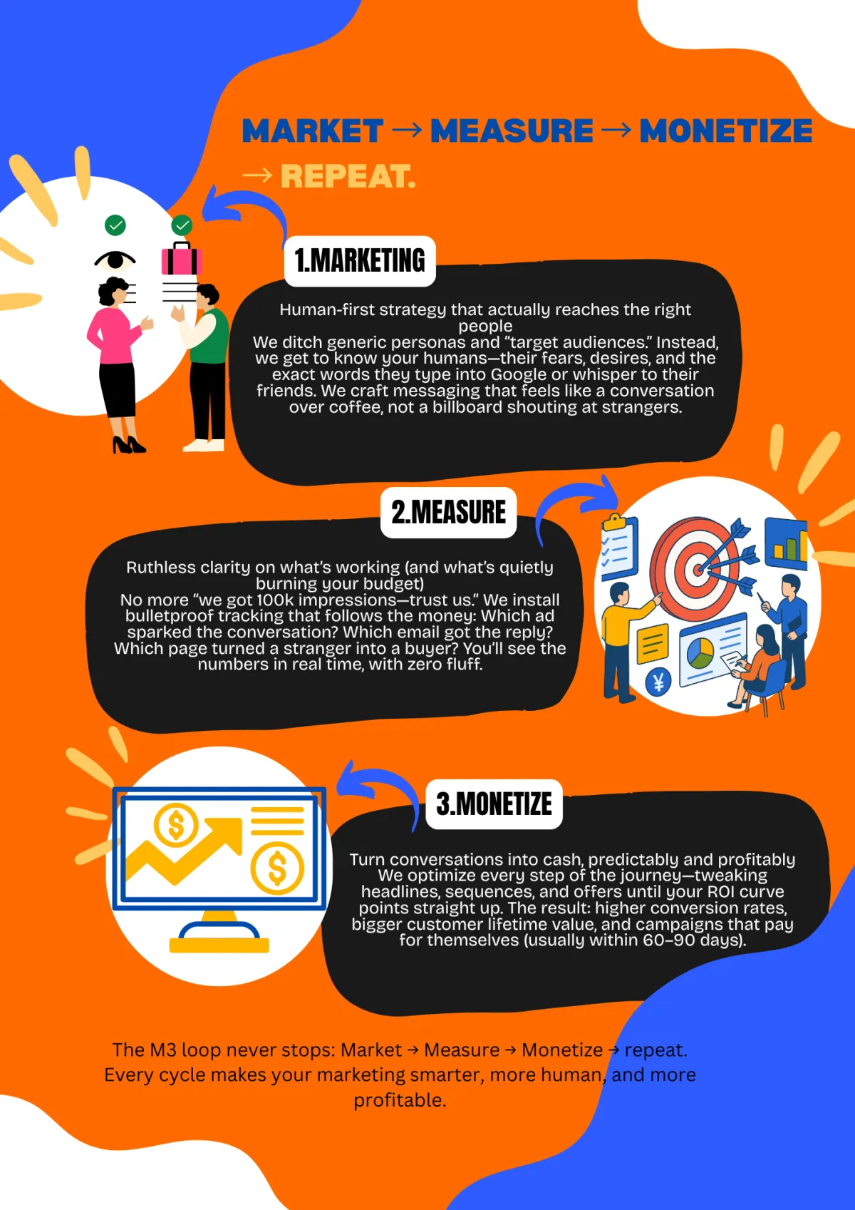While every industry varies, the M3 loop is designed for speed. We typically see significant optimizations and a clear path to ROI within 60–90 days. Because we iterate constantly (Market → Measure → Monetize → Repeat), your marketing gets smarter every single week.